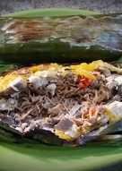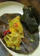 Jantung pisang yang diolah dengan aneka bumbu dan rempah pilihan serta dibungkus dengan daun pisang akan menggugah selera makan. 250 g irisan jantung pisang. 2 sdm sambal bajak.
